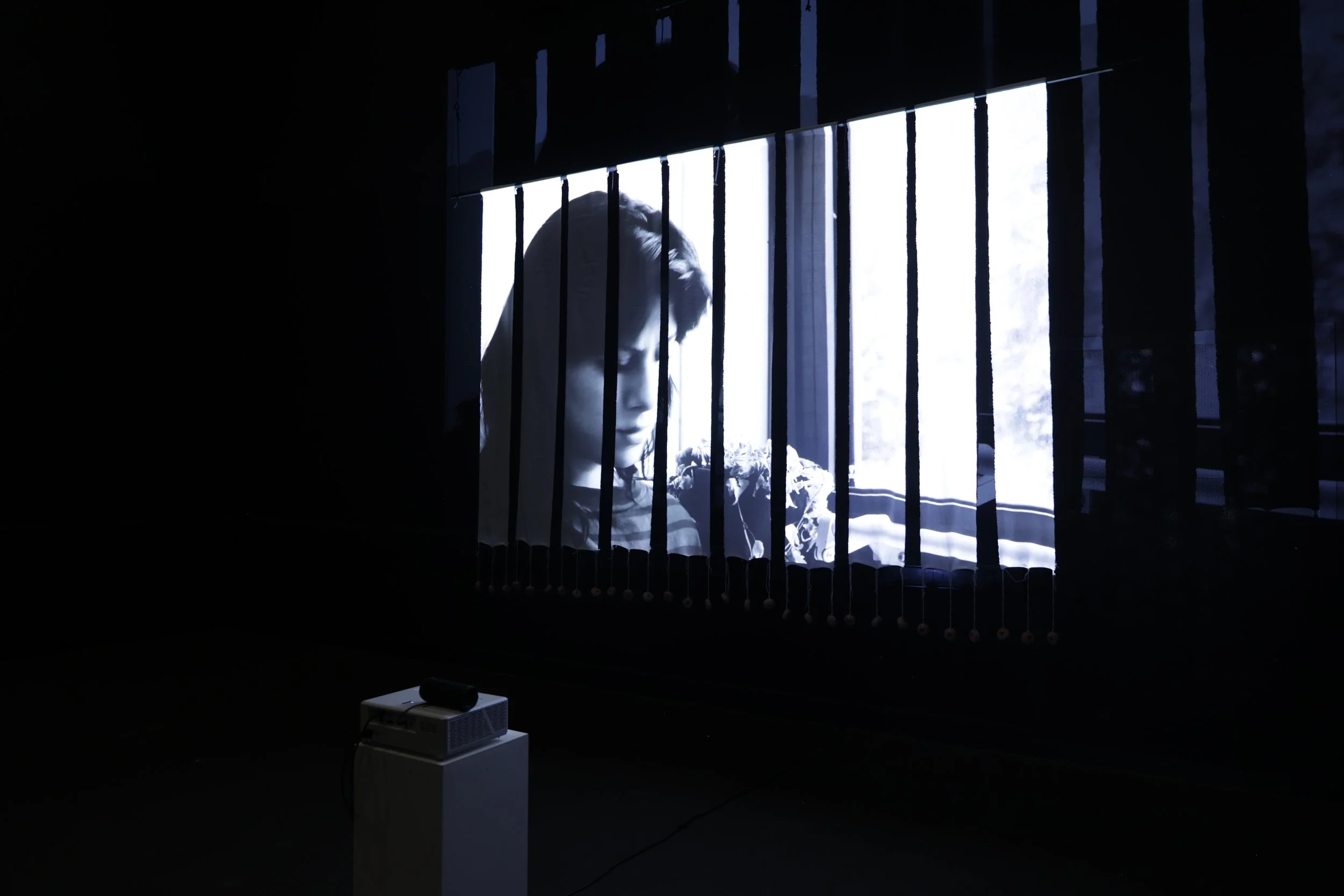 The projection screen is all handwoven cotton, and hung to resemble a traditional warp weighted loom, finished with traditional weights. On close inspection of the work faults will emerge in the fabric, little snippets of the making process and of the beauty of human error over machine made work.